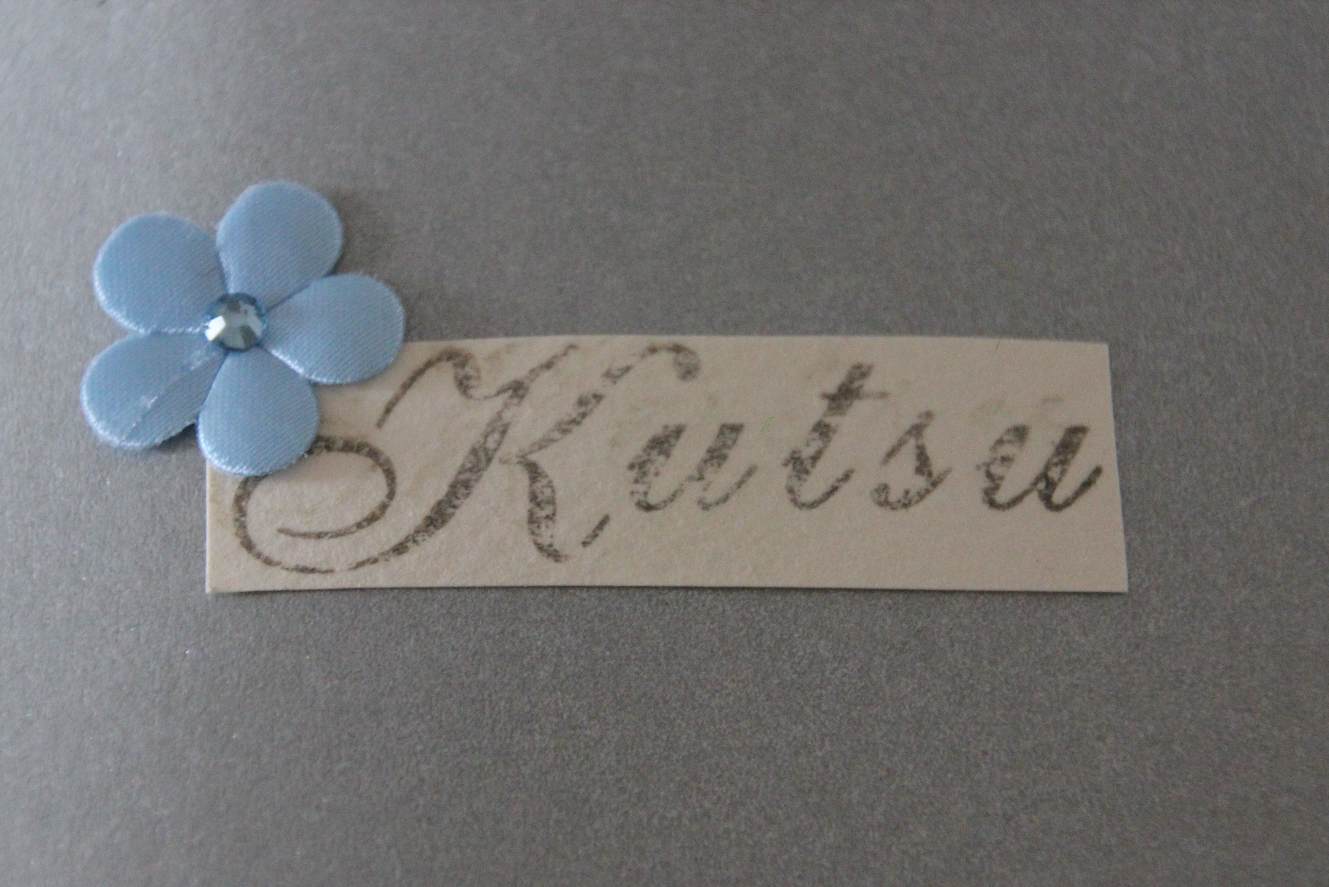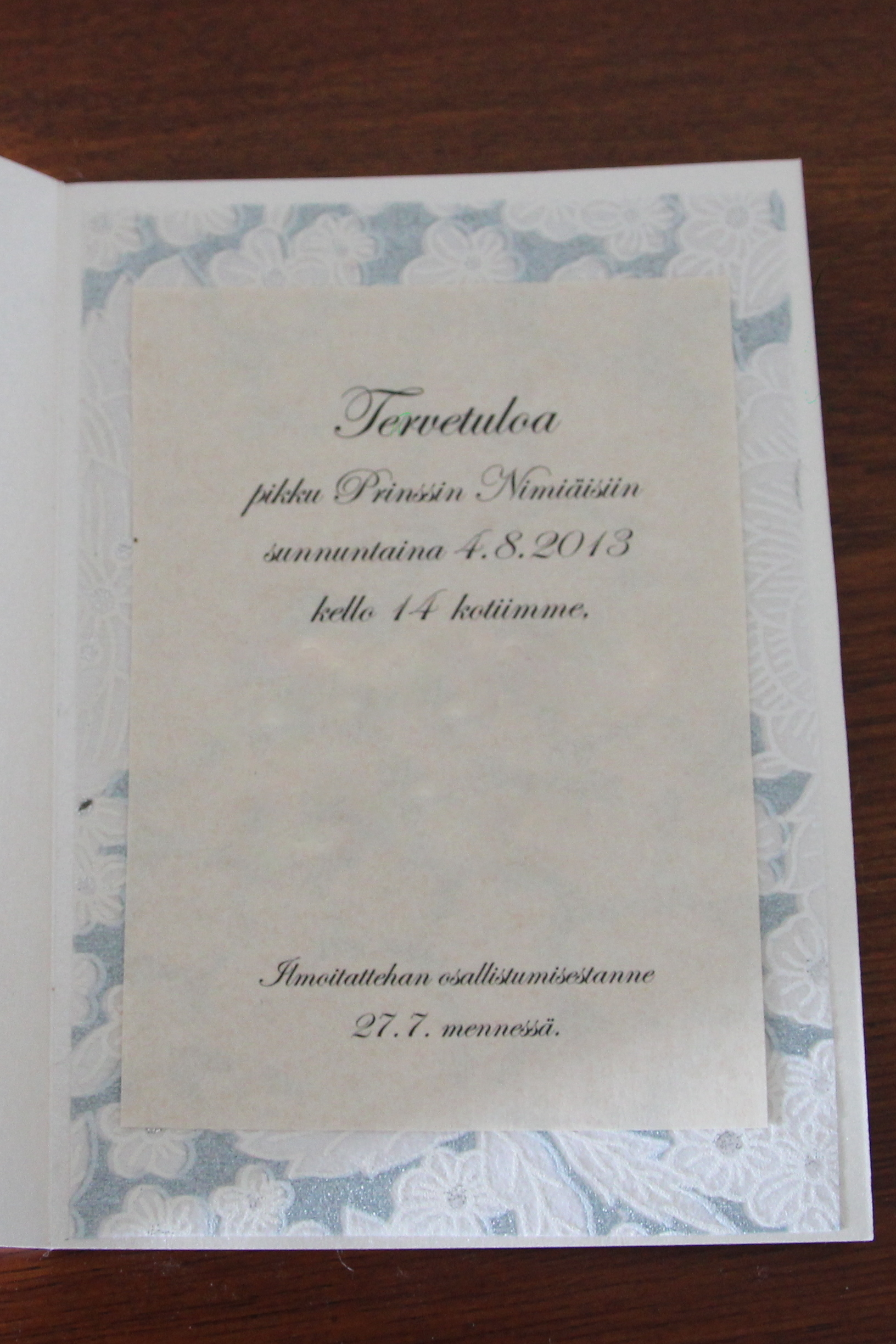 Kutsun teksti voi olla yksinkertainen. Juhlavuutta saa kauniista fontista. Myös erikoisemmille papereille voi usein printata. Pohjalla on käytetty koristepaperia. Paperit on liimattu toisiinsa ohuella kaksipuoleisella teipillä liiman sijaan.