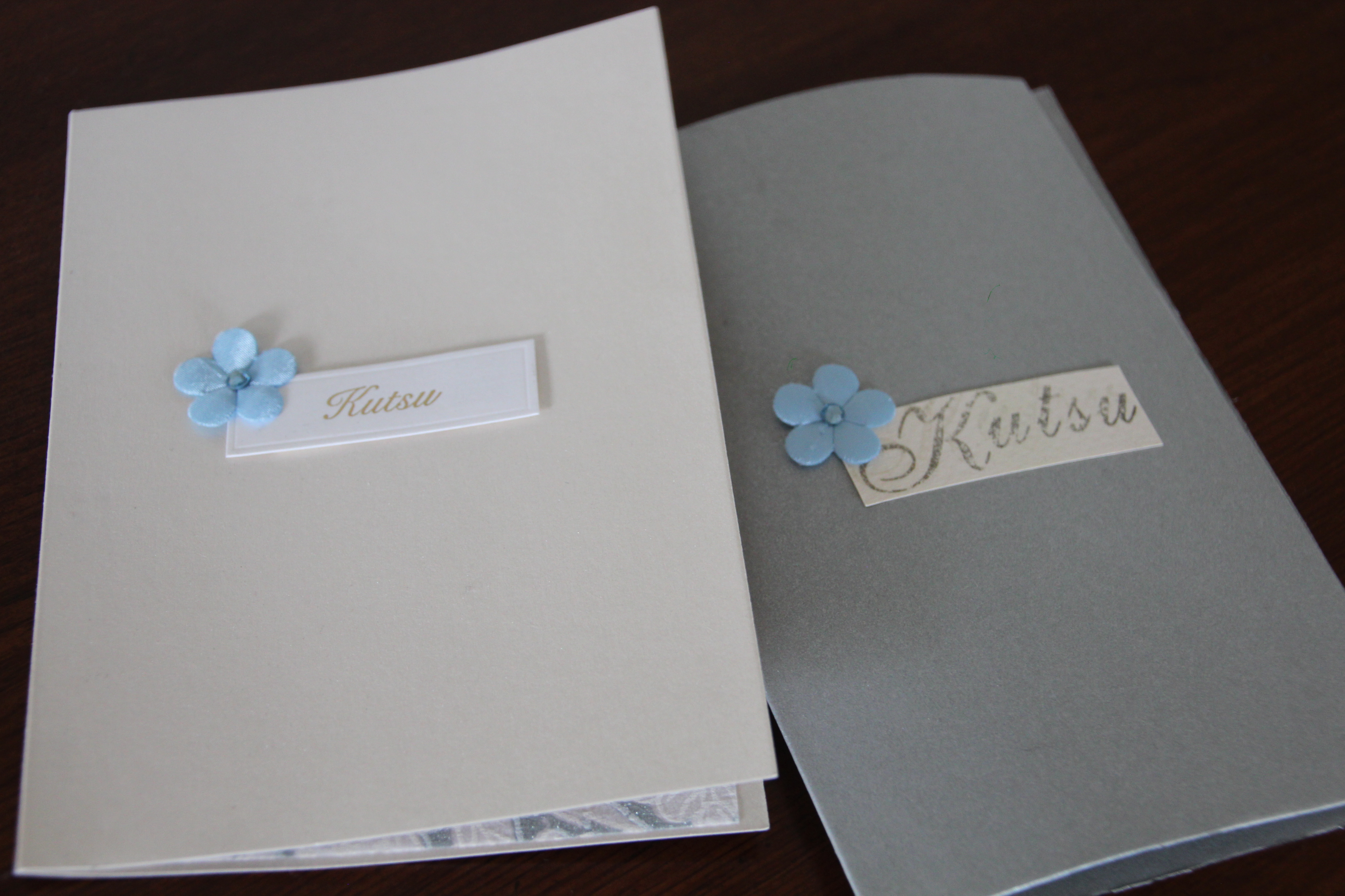 Itsetehtyihin kutsukortteihin saa näyttävyyttä kiiltävällä kartongilla. Samanlainen kutsupohja käy juhlaan kuin juhlaan: sopiva kutsu häihin, nimiäisiin ja risitiäisiin.